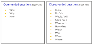 Closed questions can be answered with a single word or two, or a simple yes or no. They can begin the closing process in a conversation, or provide confirmation of a detail, but they don’t usually lead to gathering more information. Where most people need more practice is asking the open question, those where the listener is given a chance to explain, to tell how they feel about an issue, or offer suggestions.